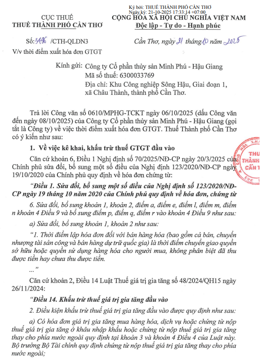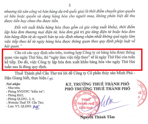 Công văn số 3496/CTH-QLDN3 - Thuế Thành phố Cần Thơ ban hành ngày 21/10/2025 hướng dẫn về thời điểm xuất hóa đơn vào ngày cuối tuần