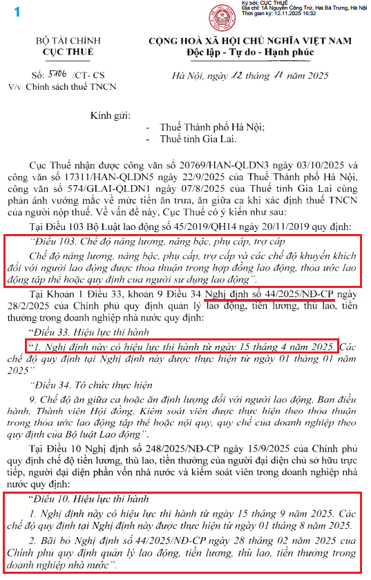 Ngày 12/11/2025, Cục Thuế ban hành Công văn 5106/CT-CS V/v chính sách thuế TNCN - về mức tiền ăn trưa, tiền ăn giữa ca khi xác định thuế TNCN thế nào?