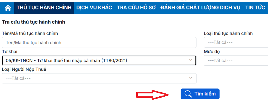 => Lựa chọn tờ khai “05/KK-TNCN - Tờ khai khấu trừ thuế thu nhập cá nhân (TT80/2021) và ấn "Tìm kiếm"