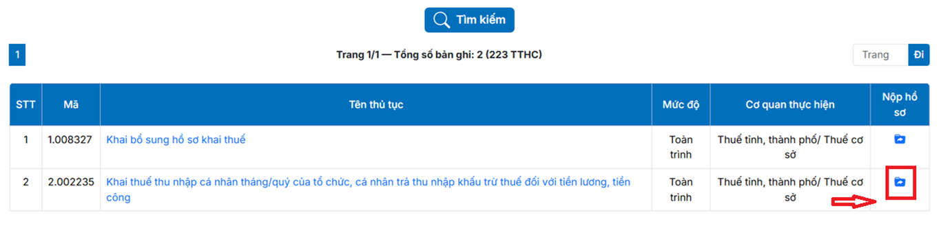 => tại dòng thứ tự số 2, các bạn click chuột trái vào biểu tượng folder ở cột Nộp hồ sơ.