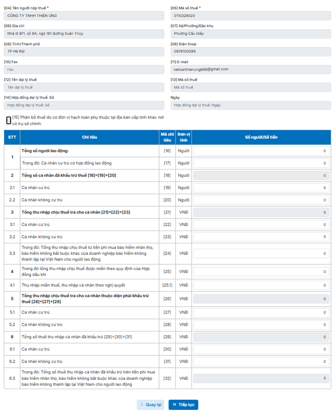=> Tiếp đó các bạn kê khai các chỉ tiêu trên tờ khai đó, rồi kết xuất XML để nộp qua trang dichvucong nhé.